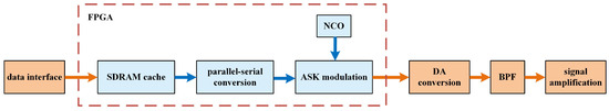 Each module in the aforementioned communication system was actually constructed with the means of hardware or software for the signal transmission experiment. Figure 7 illustrates the constructed signal transmitting side, which utilizes a field programmable logic gate array (FPGA, EP4CE10F17C8, Cyclone IV E) as its core unit. The FPGA contains two image acquisition methods: camera and data interface, and generates a carrier wave with its numerically controlled oscillator (NCO). After image data are collected by the FPGA, they undergo sequentially SDRAM buffering, parallel-serial conversion, and ASK digital modulation. Since the output signals of the FPGA are digital, a DA circuit is applied to carry out the digital-to-analog conversion. Converted signals further experience bandpass filtering to remove out-of-band noise and their amplitude is increased by an amplification circuit. Finally, the ultrasonic transmitting transducer is driven to transmit ultrasonic signals into the metal channel.
