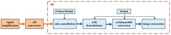 As depicted in Figure 8, the signal-receiving side is actually constructed with an amplification circuit, an AD conversion circuit, and a personal computer (PC). After the received signals pass through amplification and AD conversion circuits, they are captured by an oscilloscope and then sent to the PC. Within the PC, signals are treated with two routes of echo cancellation. One route is called LMS adaptive filtering which is built with Matlab. Another one is DPRNN processing which is established with Python. The implementation of ASK demodulation, serial-parallel conversion and image restoration are also performed on the PC.