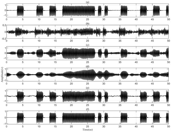 Signals before and afte echo cancellation. (a) Signals on the transmitting transducer. (b) Signals on the receiving transducer. (c) Signals after LMS adaptive filtering. (d) Signals after RLS adaptive filtering. (e) Signals after PNLMS adaptive filtering. (f) Signals after DPRNN treating.