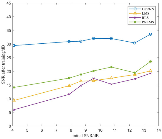 As shown in Figure 12, SNR of initial received signal apparently affects echo cancellation of LMS, RLS, PNLMS and DPRNN. Low SNR of initial received signal suppresses the efficiency of the adaptive filter and DPRNN model, but compared with adaptive algorithms listed, DPRNN exhibits higher bearing capability against this impact in a fashion of relatively slow declining rate. After these signals with different initial SNRs were conducted with DPRNN echo cancellation, their SNR improvements were still higher than 20 dB, implying that they were greatly applicable.