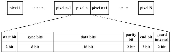 Based on the aforementioned adaptive filter and trained DPRNN model, we conducted the image transmission through a 50 mm thick aluminum metal plate. On the transmitting side, the FPGA chip acquires the data of an image with 100 × 100 pixels with one of its I/O interfaces and saves them in its ROM. This image has the RGB565 color format in which each pixel uses 16 bits for color value. As shown in Figure 13, each pixel cell is composed of start, sync, data, parity, end and guard interval bits, entirely occupying 32 bits. The following steps of signal transmission were the same as those of the aforementioned data transmission. The image recovery was also implemented with Matlab, being involved multiple steps: signal reading, AC-DC conversion, envelope extraction, sampling and decision-making. Finally, the recovered images were displayed on the PC screen.