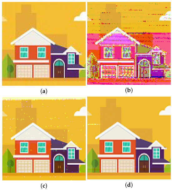Figure 14 displays images recovered from signals treated with different approaches of echo cancellation. Figure 14b is the recovered image without any echo cancellation, in which severely distorted lines and colors imply the existence of strong intersymbol interference. Figure 14c is the image recovered after received signals undergo LMS adaptive filtering. The distortion degrees of patterns and colors in Figure 14c have been obviously mitigated in comparison with Figure 14b, revealing that LMS adaptive filtering can serve echo cancelation and weaken intersymbol interference to some extent. Figure 14d represents the image recovered after received signals were processed with DPRNN echo cancellation. In this case, no discernible distortion can be found, meaning that both intersymbol interference and noise have been almost eliminated, and DPRNN is significantly effective for echo cancellation.