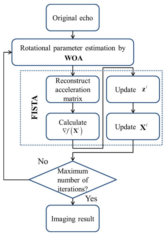 WOA and FISTA were alternately iterated to obtain more accurate ISAR imaging results. We also employ asynchronous iterations to ensure convergence of WOA and FISTA. Specifically, each time the loop shown in Figure 2 is executed, FISTA is updated once and WOA is updated Q times.