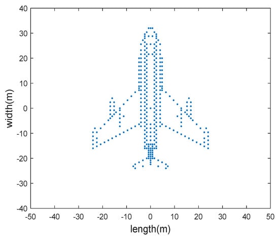 In this section, we use simulated and measured datasets to validate the effectiveness of the proposed method. The simulated aircraft contains 330 scattering centers. We set the radar carrier frequency at 10 GHz, bandwidth at 2 GHz, number of pulses at 256, and pulse repetition frequency (PRF) at 200 Hz. The origin of the target coordinate system is 20 km away from the radar. The angular velocity is 0.03 rad/s and the angular acceleration is 0.01 rad/s2. The shape of the simulated aircraft is shown in Figure 3.