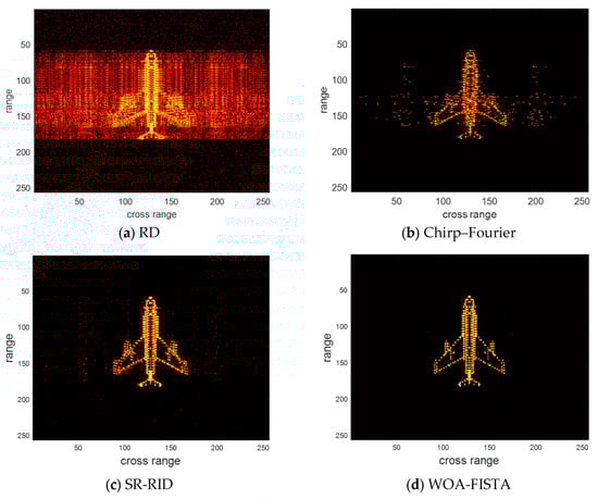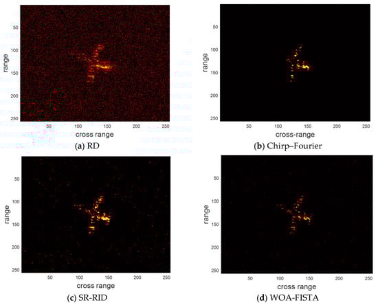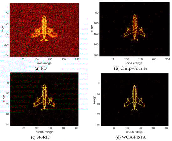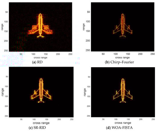 The parameters of WOA-FISTA are set to I = 4, L = 5, Q = 10, d = 1. We adopt the RD algorithm, chirp–Fourier transform method [16], and sparse reconstruction-range-instantaneous Doppler (SR-RID) [10] as control groups, where RD algorithm is the most common ISAR imaging algorithms, chirp–Fourier transform method is a typical PE method and SR-RID is an algorithm that combines RID methods with compressed sensing techniques. Under the conditions of signal-to-noise ratio (SNR) is 10 dB, the imaging results of the above four methods are shown in Figure 4. Entropy and contrast are used to quantify imaging quality. The definition of entropy and contrast can be written as