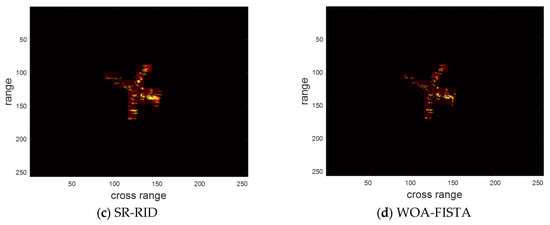 We can find in Figure 4 and Table 1 that the imaging result of RD is severely defocused, especially the wings. These defocused scattering centers span multiple range bins. The above phenomenon amply demonstrates the significant impact of target maneuvering and MTRC on ISAR imaging. Chirp–Fourier solves the defocusing to some extent but introduces false peaks. This makes the chirp–Fourier result less than ideal. The SR-RID results do not have false peaks, but the defocusing at the wings is not completely solved. Both chirp–Fourier and SR-RID failures are due to unsuccessful correction of the MTRC. In comparison, the result of WOA-FISTA is well-focused and has the lowest entropy and highest contrast. These experimental results demonstrate that WOA-FISTA can effectively eliminate the effects of target maneuvers and MTRC on ISAR imaging.