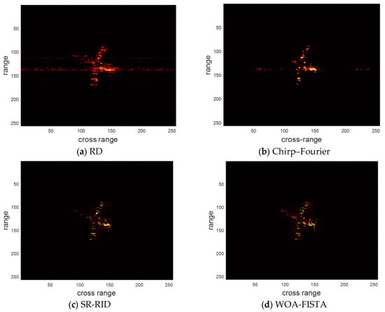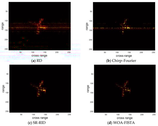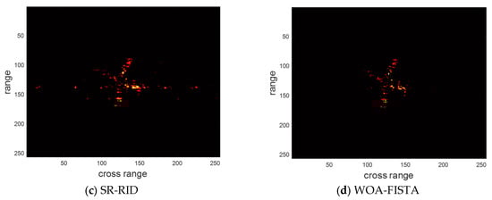 Next, we adopt maneuvering Yak-42 measured dataset to validate the effectiveness of WOA-FISTA. A C-band radar records the dataset with a bandwidth of 400 MHz, a PRF of 100 Hz, and a carrier frequency of 5.52 GHz. The dataset contains 256 pulses; each pulse has 256 sampling points. We provide the imaging result of RD, chirp–Fourier, SR-RID, and WOA-FISTA in Figure 7 and the entropy and contrast of the above methods in Table 4.