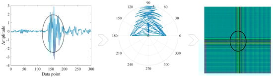 Gramian Angular Difference Field is a coding method that converts one-dimensional time series into two-dimensional images [20]; using it as preprocessing of vibration signals allows the network to efficiently identify vibration signals. Assuming the existence of a one-dimensional time series X = {x1, x2, …, xn}, the GADF coding process can be divided into the following steps, some notations used in this paper are illustrated in Table 2.