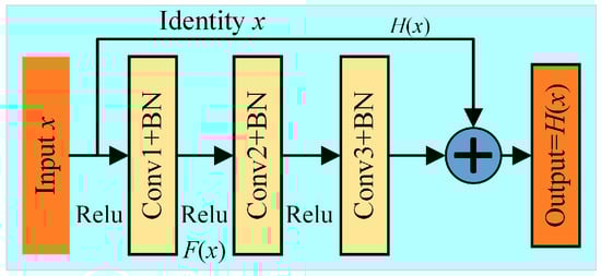 In traditional convolutional neural networks, with the number of network layers, stacked models will have the problem of gradient disappearance or explosion. Residual neural networks emerged to solve this problem and have been widely used in image processing [21]; the structure is as shown in Figure 2, and determined by Equation (5).