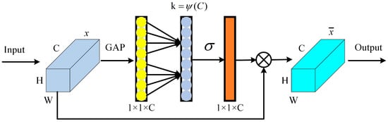 Secondly, feature interaction between channels is achieved by 1D convolution of Equation (11); where the size of the 1D convolution kernel k is determined by Equation (12):