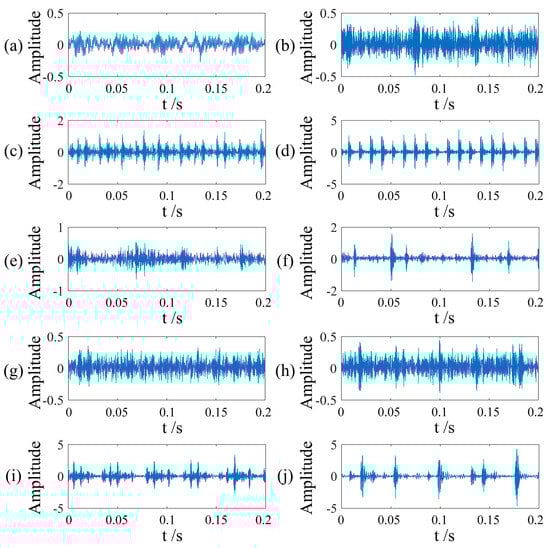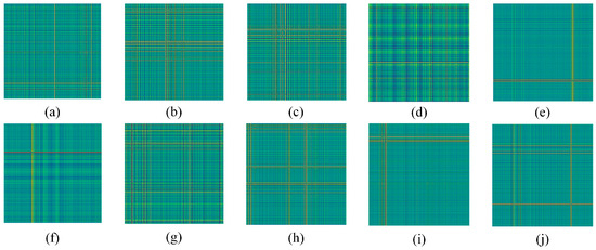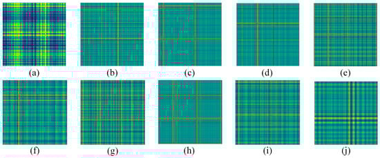 Vibration images of faults. (a) NO; (b) RE-0.007in; (c) IF-0.007in; (d) OR-0.007in; (e) RE-0.014in; (f) IR-0.014in; (g) OF-0.014in; (h) RE-0.021in; (i) IF-0.021in; (j) OF-0.021in.