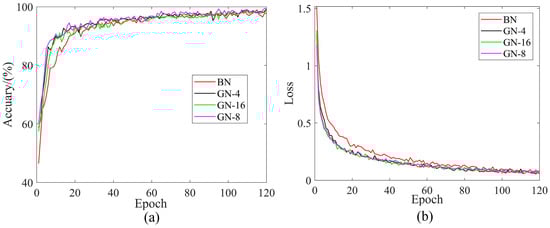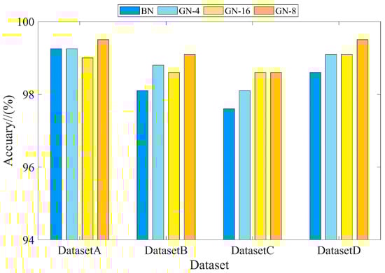 The BN and GN methods were introduced for comparison under four datasets to highlight the superiority of the GN method. The number of groups in GN has an impact on the performance of the model, so different numbers of groups for the GN method were considered in this experiment. Each training iteration was 120 rounds and the training parameters are shown in Table 5. Figure 10 and Table 6 show the results of comparing the two methods with four datasets. For further analysis, DatasetA was taken as an example, and the corresponding training curves are shown in Figure 11.