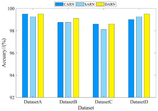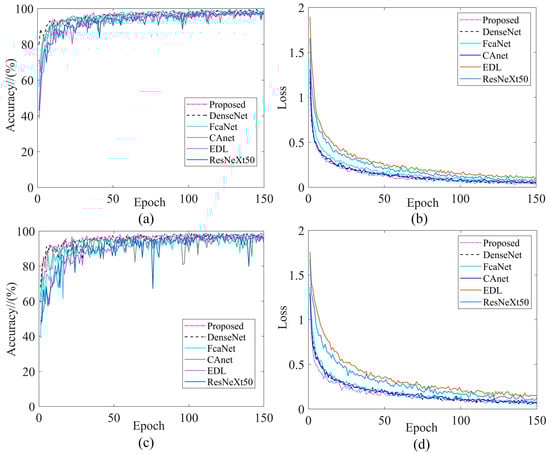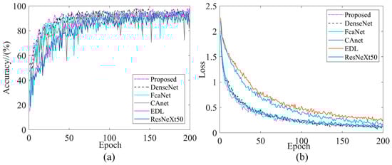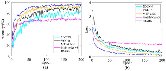 Taking Dataset1 as an example, the corresponding training performance curves were shown in Figure 19. It can be seen that the two training performances of IDARN were better than other advanced CNN models. It is worth noting that the Mobilenet-v3 model cannot achieve good classification results after 200 iterations, and more iterations were needed; the rest of the models all converge stably.