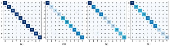 Three different damage diameters of the inner ring, outer ring (@6), and rolling body types were selected as the failure data samples, and one health state data sample was also selected, which was divided into ten categories, and the different failure types were recorded as “IF”, “OF (@6)”, “RE”, and “NO”. It is worth noting that DatasetB/C/D were imbalanced datasets, simulating the missing data in real working conditions; DatasetA can be regarded as a balanced dataset in the ideal state. To avoid the effects of chance, the 400 data points in each category were randomly assigned in a ratio of 9:1 for training and validation. For the imbalanced data, 100/200/300 GADF data were randomly selected from the measured signal segments; again, these were randomly assigned in a 9:1 ratio, and the validity of the proposed model classification was verified using the datasets in Table 4.