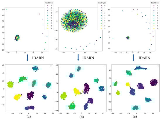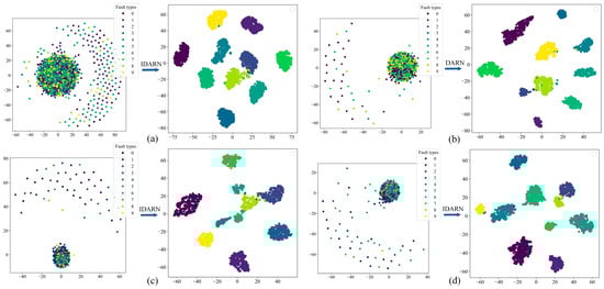Figure 21 shows the confusion matrices of the proposed method under the three datasets. It can be seen that label 1 and label 2 have the lowest accuracy under the three datasets and the rest of the labels achieve full classification. Figure 22 shows the results obtained by the proposed method after t-SNE clustering under the three datasets; it can be seen that there was no confounding between the different categories and the faults were classified well. Therefore, IDARN can be used for fault classification of small sample imbalanced data.