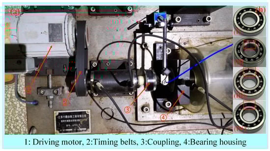 The experimental data were obtained from the bearing fault experimental equipment (QPZZ-II), as shown in Figure 16a. According to the practical application, an acceleration sensor was placed on the bearing housing to collect the vibration data of the bearing. In the experiment, the sampling time of the sensor was set to 15 s each time, and the sampling rate was 20480 S/s. Depending on the designed fault scenes, these data were labelled as “Normal (NO)”, “Inner Ring Fault (IF)”, “Outer Ring Fault (OF)”, and “Rolling Element Failure (RE)”, and the different bearing states were shown in Figure 16b.