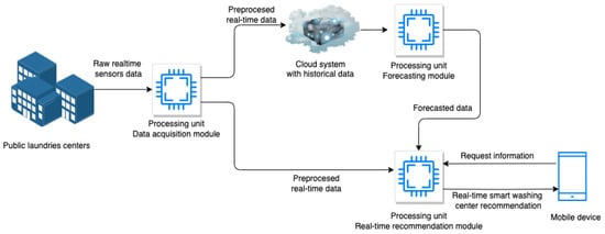 Figure 1 illustrates our proposed real-time system architecture from a high-level perspective. The sensors attached to the washing machines record the functioning data of the devices in real time. Once recorded, data are sent to the data acquisition module and preprocessed. The information extracted is stored in the cloud system, which contains the historical usage data from all the connected devices. By using this approach, the data-intensive load is moved to the cloud. Based on historical data, the forecasting module predicts future usage. The real-time recommendation module uses forecasted data regarding the usage of the devices and their current running status and will compute a list of recommended available devices to be used. The system users interact with it by using an application on their mobile phones. This way, not only will the waiting time be reduced, but resources will be allocated so that overbooking or underutilization of the machines will be avoided.