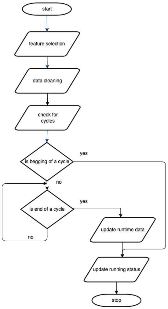 Our system’s devices are designed to function in cycles. One cycle is defined by the beginning of a task, its running (with the purpose of solving the task), and its stopping. For example, in the case of washing machines, the task is to clean the clothes. In [37], a method for detecting cycles from raw data recorded from devices with running patterns similar to the ones described above is introduced.