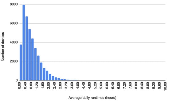Figure 3 presents the usage patterns of all the appliances from the initial raw sensors dataset. The histogram contains the average number of hours an appliance was used per day. The maximum average daily amount a device was used in our dataset is 10 h, representing the upper limit on the horizontal axis. On the vertical axis, we have the number of devices. As can be seen, most of the devices are used for under 3 h. Due to the differences in the number of devices with average run time in the interval [3 h; 10 h], some devices are not visible in the histogram.