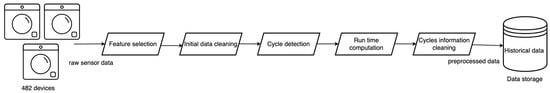 On the selected raw sensors dataset, we applied the steps corresponding to the data acquisition module illustrated in Figure 2 to select only the features corresponding to the running of the devices. We cleaned the data and detected the run cycles, marked their start and end, and computed the overall running duration for each cycle. We eliminated the washing cycles that lasted less than 5 min or more than 5 h for a supplementary cleaning step and created our historical dataset from the resulting data. Historical data were further used in the forecasting module. Figure 4 illustrates the steps performed to transform the raw sensor data into historical data that were used for forecasting.