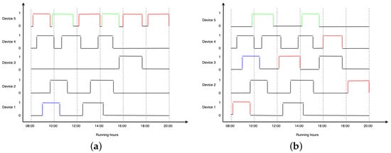 To illustrate our proposed algorithm for smart real-time machine recommendations, a simulation of the interaction has been made. We consider the machines as being localized at different locations and operational between hours 8:00 and 20:00, with a variable duration of cycles. To maintain the visual explainability of the system, five devices have been chosen, where four of them are forecasted to be used below the , and one of them over it. For , we use a value equal to 3. Figure 5a illustrates the forecasted running cycles of the simulated machines. On the OX axis, we have the running hours of the devices, and on the OY axis, we have the state of the devices from 1 to 5. When the value for each device is 0, it means that the device is not running, while a value of 1 means it is running.