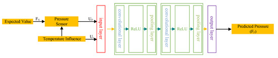 Pooling layers within the CNN play a crucial role in reducing the dimensionality of the feature maps, thereby enhancing feature extraction capabilities. In the context of temperature compensation, these layers aid the network in identifying temperature-invariant features, thus enhancing the model’s resilience to temperature fluctuations and reducing computational demands. The fully connected layer integrates the features derived from previous layers to execute the final regression or classification tasks. For temperature compensation, this layer empowers the CNN to generalize across varying temperature conditions, improving the robustness and adaptability of the model to different thermal environments. It enables the network to learn and adjust to temperature variations, facilitating effective temperature compensation across diverse operational settings [32,33,34].