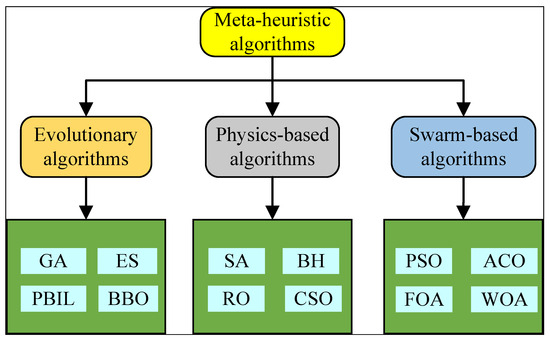 The Whale Optimization Algorithm (WOA) stands out as an innovative meta-heuristic optimization framework, drawing inspiration from the sophisticated hunting techniques of humpback whales. The appeal of meta-heuristic algorithms like the WOA lies in their gradient-free operation, which allows for a broad exploration of the solution space, thereby mitigating the risk of convergence to local minima—a common challenge in gradient-based optimization methods. These algorithms have found increasing application across various engineering domains due to their flexibility, simplicity in implementation, and robustness in navigating complex optimization landscapes. As depicted in Figure 3, meta-heuristic algorithms can be classified into three principal categories. The first category encompasses evolutionary-based intelligent optimization algorithms, such as Evolutionary Strategies (ESs) and Genetic Algorithms (GAs), which mimic natural evolutionary processes. The second category includes physics-inspired intelligent optimization strategies, exemplified by Simulated Annealing (SA) and the Black Hole Algorithm (BH), which draw analogies from physical phenomena to guide the search process. The third category comprises swarm intelligence-based optimization methods, such as Particle Swarm Optimization (PSO) and Ant Colony Optimization (ACO), which are inspired by the collective behavior of social organisms. Incorporating a Whale Optimization Algorithm (WOA) into CNN architectures presents a compelling strategy for refining network parameters. This enhancement strengthens the model’s ability to identify optimal feature representations, thereby boosting its overall efficacy in complex pattern recognition tasks, such as temperature compensation in drilling pressure measurements [35].