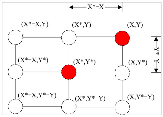1. Shrinking encircling mechanism: This strategy is modeled by progressively diminishing the magnitude of the parameter in Equation (3), where the value of oscillates within the range . The decrement of a is linear as per Equation (5), facilitating a simulated contraction towards the prey. Specifically, when lies within , the subsequent position of the whale is determined within the bounds defined by its current location and the optimal target position. As depicted in Figure 5, within a two-dimensional framework, if falls within , the prospective position of the whale is constrained to the region demarcated by points (X, Y) and (X*, Y*).
