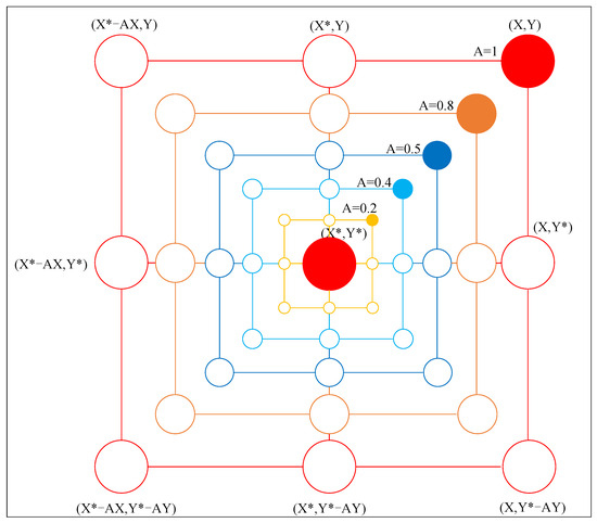 Visualization of the shrinking encircling mechanism in a two-dimensional space, the red dot (X, Y) represents the current position of the whale, (X*, Y*) represents the optimal position, and dots of other colors represent the position of the whale when the value of A varies.