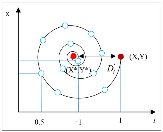 2. Spiral position update: As depicted in Figure 6, this method starts by calculating the gap between the whale’s present coordinates (X, Y) and the prime location (X*, Y*). A logarithmic spiral route is then established between these coordinates, mimicking the humpback whale’s helical approach to its prey. The principal formula for this helical trajectory is presented in Equation (6).