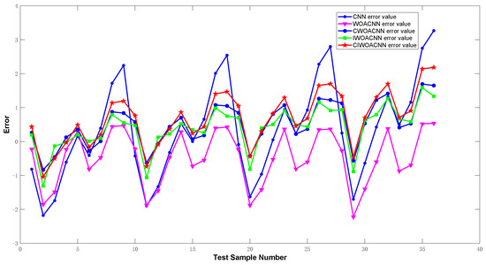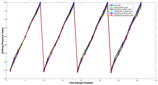 To validate the efficacy of the proposed algorithm, we compared five neural network models, CNN, WOA-CNN, C-WOA-CNN, I-WOA-CNN, and C-I-WOA-CNN, using the test data for training. Figure 7 and Figure 8 depict the comparison of predicted versus actual pressure values and the error analysis post-optimization, respectively.