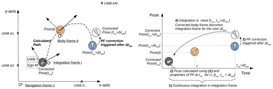 A subscript m will indicate the modality by which a variable has been measured or derived. The different modalities are acc, gyr, odom and uwb for, respectively, accelerometer, gyroscope, odometry, and UWB. The pf subscript is given to the variables of the weighted particle from the particle filter (PF) at the reset time tres.