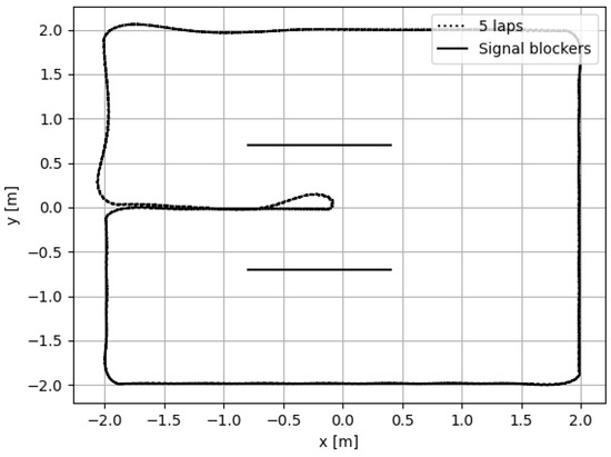 A Turtlebot3 from ROBOTIS Co., Ltd., Seoul, Republic of Korea, was upgraded to include mo-cap markers and a UWB tag, as can be seen in Figure 3, and software was written to control the trajectory of the robot using mo-cap as feedback. Mo-cap will also provide mm-level accuracy on the ground truth. Table 4 shows the models of the sensors used for the evaluation of the proposed method. One continuous trajectory in the shape of a U was defined. The trajectory consists of sharp corners, which induce a particularly hard condition on the ego-motion sensors. The trajectory can be seen in Figure 4. Each experiment consisted of five laps. It took about 500 s to complete all five laps. Three experiments were conducted: