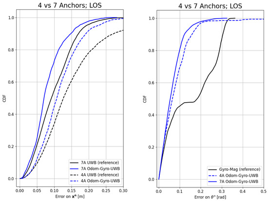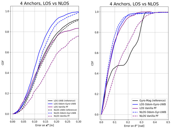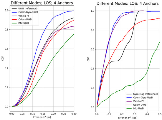 In Figure 5, the CDF is shown of the error on the position and orientation with respect to the ground truth as measured by mo-cap for the different modalities using four anchors in the LOS. In this experiment, the Odom–Gyro–UWB modality (blue) performed the best and outperformed all other modalities. Therefore, this modality was used for the analysis of the NLOS and the number of anchors. Moreover, the sensors of this modality were used for the vanilla particle filter implementation shown in purple.