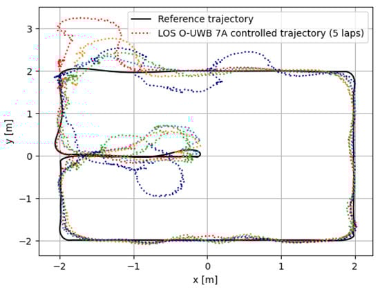Figure 8. Robot controlled in real time with the UWB pose estimation algorithm. The expected trajectory that the robot performed in the offline experiment with the mo-cap as feedback is shown in black. The dotted color lines show each lap when the algorithm is used as feedback to the trajectory control instead of the mo-cap. Each color represents one of the 5 laps performed with the algorithm used as pose control.