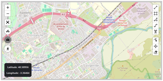 The web application was intuitively designed for propagation loss analysis and antenna positioning optimization. It features a main interface where various tools (icons) can be found for selecting and configuring specific areas, as depicted in Figure 2. This main interface resembles a map, allowing users to navigate and locate the area for analysis. Additionally, if users have the coordinates of the area, the tool provides methods for manually inputting these data, thereby enhancing result accuracy.