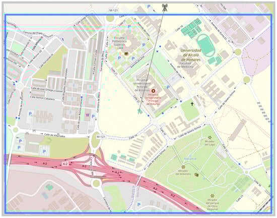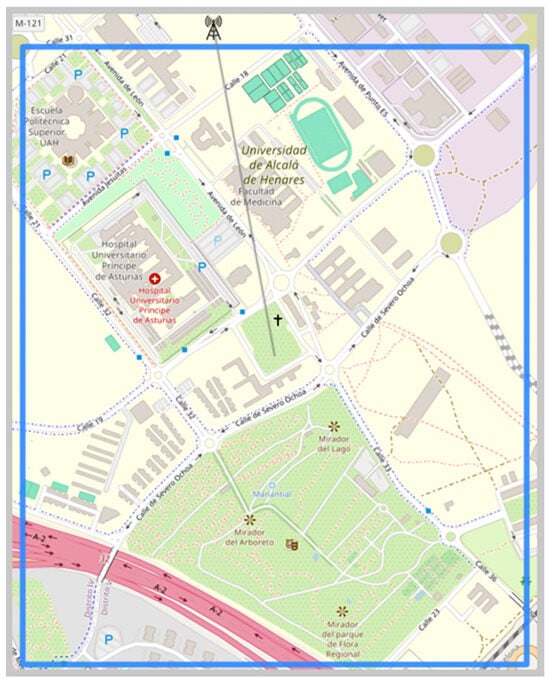 In this section, a more detailed analysis will be conducted on the calculation of propagation losses and their application in antenna positioning. To achieve this, a larger area located in Alcalá de Henares, Spain, was selected. The selected area corresponds to a suburban zone with a lower population density compared to an urban environment. In Figure 8, the selected area can be observed, characterized by few medium-rise buildings primarily dedicated to universities, hospitals, and sports facilities, as well as ample outdoor parking lots and wide, tree-lined streets with generous spacing between them [].