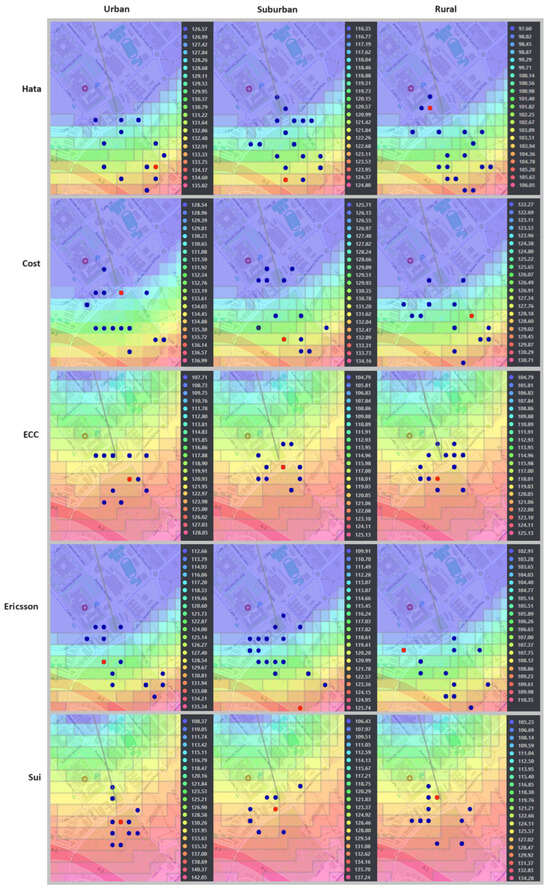 Although this initial experiment was conducted using all the models outlined in Table 1 for the specified area in Figure 4, where environments (urban, suburban, or rural) are assumed, it is important to note that not all models presented in Table 1 are applicable to every area. In fact, each model has its own limitations regarding operating frequency, heights of base and mobile antennas, the distance between these antennas, and, of course, the surrounding environment. Therefore, the user conducting the analysis should be familiar with the type of environment and understand how the selected model operates.
