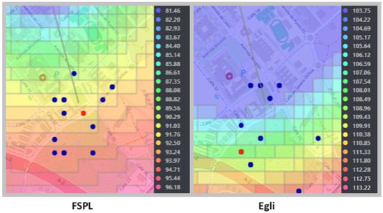 There are several propagation models that can be deterministic or empirical, and even a combination of both [,,]. Of these, empirical methods are the most commonly used due to their simplicity and applicability to any experimental area [,,,]. These empirical models are strictly derived from field measurements and rely on path loss prediction [,,]. In this study, seven of these models were examined: Cost-231-Hata [,,,,,], FSPL [,], Egli [,], ECC-33 [,,], Ericsson [,], and Sui [,,], in addition to the Hata model [,,].