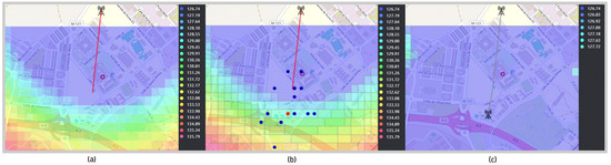 The average losses for the selected area are 131 dB, with coverage provided by a first transmitting antenna, as depicted in Figure 9a. It should be reiterated that the placement of the first antenna adheres to the analytical criteria determined by the user, as outlined in Section 3.1. The optimal coordinates for placing the second antenna are at a latitude of 40.506 degrees and a longitude of −3.349 degrees, marked by a red dot in Figure 9b. When positioning the second antenna, the average losses decrease to 127 dB. It is important to note that losses are depicted using a color gradient, ranging from light blue to pink. Figure 9c clearly illustrates the expanded coverage for both antennas.