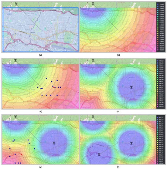 Once the second antenna is positioned at the determined optimal coordinates, new propagation losses can be calculated to establish the optimal coordinates for a third base transmitting antenna. Following the process for placing additional antennas, as depicted in Figure 10, the second base transmitting antenna is configured, and propagation losses are then recalculated. The calculation of these new propagation losses involves the two antennas already positioned, as indicated in Section 2.2. Figure 11d displays the updated loss map, illustrating the coverage provided by the two positioned antennas. The new average for propagation losses is identified at 143 dB. Subsequently, the second antenna is reconfigured to determine the optimal coordinates for the third base transmitting antenna, indicated by a red point in Figure 11e. Figure 11f shows the third base transmitting antenna positioned, along with the coverage provided by the three antennas arranged in the selected area. In this scenario, the average for propagation losses decreases to 135 dB, recalling that the calculation of this value involves all the antennas previously positioned.