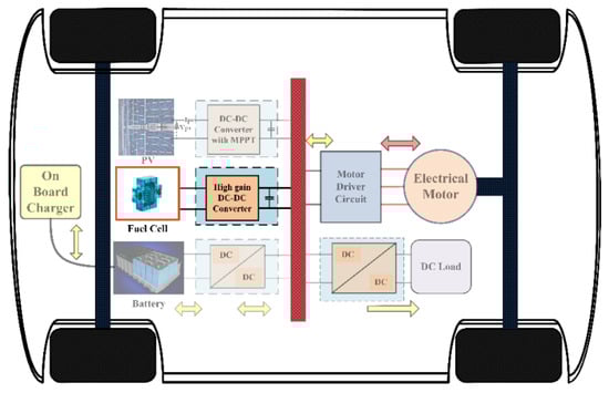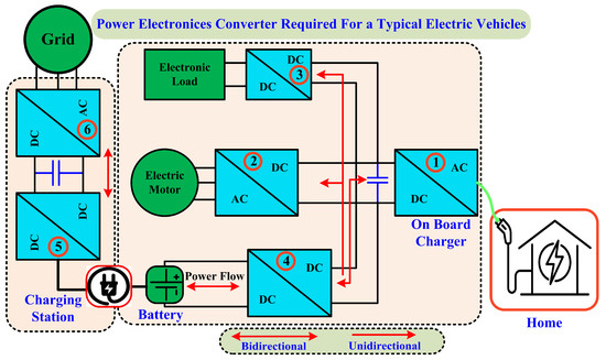 EVs’ social, environmental, and financial benefits have contributed to their rising popularity over the past few years. Two types of energy storage devices are typically used in electric and hybrid electric designs: the “main energy system” (MES) and the “rechargeable energy storage system” (RESS). While MES increases fuel efficiency, RESS improves acceleration and regenerative braking. As the output voltage of these devices varies with load or state of charge, vehicle designers face significant challenges when integrating energy storage/supply devices with a traction drive [5]. The demand for power electronics converters has grown significantly along with the use of EVs. Power electronics converters are essential for EVs because they convert energy from a power source into a form suitable for their electric drive system. It is absurd to think EVs could run without power electronics converters. This significance has sparked an explosion in research into power electronics converters for EVs across the globe. EVs and the infrastructure that supports their charging use converters of all kinds, such as DC-DC, DC-AC, and AC-DC. In this case, DC-DC converters are more critical for integrating EV driving systems with energy sources and storage systems [6]. The required power electronics converter for an electric car and its charging infrastructure is illustrated in Figure 3.