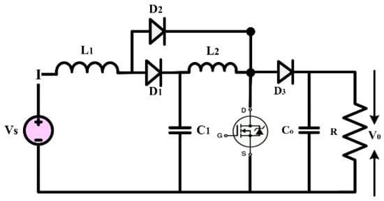 The conventional QBC is utilized for in-depth analysis, and the structure of the converter is depicted in Figure 5. Compared to a traditional boost converter, a QBC has better gain and can draw a current without ripples from sources that do not produce a pulsing input current. As a result, the sources will be more reliant on each other [31,32,33]. The increased interdependence can enhance the overall performance and efficiency of the system. In addition, the QBC’s capability to maintain a smooth current flow makes it ideal for use when a reliable and steady power source is necessary. This is particularly important for delicate electronic devices or precise instruments.