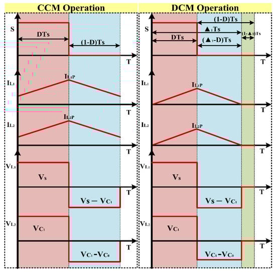 Based on the converter’s switching behaviors, two modes are provided: CCM and DCM. The analytical waveform of the suggested converter is shown in Figure 7.