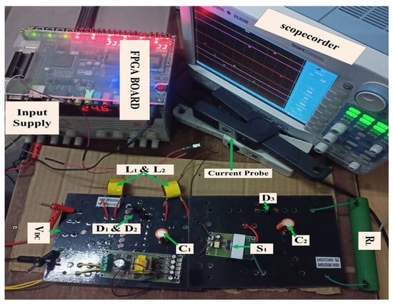 The high-gain converter shown in Figure 15 is derived from [45], which explores a DC-DC boost converter with a quadratic voltage gain specially tailored for medium- and low-power applications. The design of the converter incorporates a single-stage, non-isolated configuration. The recommended converter provides a much higher level of efficiency when compared to a typical QBC. It accomplishes this through a streamlined design incorporating just one switch, making implementation easier. This product is highly compatible with renewable energy sources because of its continuous current mode operation and lack of a linked inductor. Compared to other currently available topologies, the suggested converter showcases exceptional performance in terms of efficiency and voltage gain, especially in non-isolated scenarios. This study analyzes the findings from a simulation, experimental data, and comparisons with other converters. It also covers expressions for steady-state operating, efficiency, and voltage gain, considering nonidealities. The efficiency of the suggested converter has been verified to be over 88% through extensive simulations and experiments.