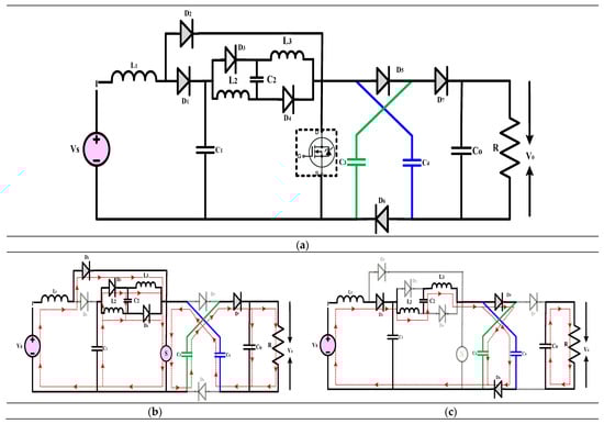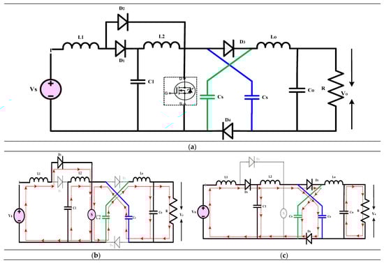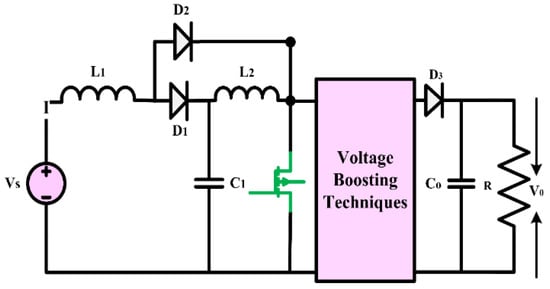 Modern electronic applications use a broad array of DC-DC converters to modify input voltages to satisfy operating needs dynamically. These converters are integral to electronic systems, which may be categorized into isolated and non-isolated varieties. To ensure that changes on the input side do not impact the output, isolated DC-DC converters utilize transformers to achieve galvanic isolation between the input and output. Because it has a ground, the converter’s input is entirely separate from the output. Depending on the setup, the output polarity can provide either positive or negative numbers [9]. Despite their superior electrical safety, isolated converters come with a price tag, a weight penalty, and many other issues, including thermal effects, core saturation, leakage inductance, dimensional constraints, and high voltage spikes in switches. On the other hand, since non-isolated DC-DC converters lack galvanic isolation, changes in the input and output are directly correlated. Despite having fewer components than their isolated counterparts, they still require careful correction to perform at their best. High-duty cycle ratios, insufficient voltage gain, and the need for additional circuitry are problems. However, non-isolated DC-DC converters perform better than their isolated counterparts in applications related to EVs. Scientists are striving to enhance the efficiency and functionality of non-isolated DC-DC converters to progress their technological capabilities. In non-isolated converters, every converter topology has its pros and cons. To illustrate, the DC/DC boost converter needs to improve regarding electrical isolation. Furthermore, the switch is subjected to intense strain due to the significant magnitude difference between the input and output. The topology is bulky and heavy and has problems with high currents and voltage ripples. A straightforward integrated multilevel DC/DC converter topology can reduce inductors’ volume and weight and increase their efficiency by lowering input and output current and voltage ripples. However, when a large voltage step-up ratio is needed, these structures fail to operate effectively [10,11].