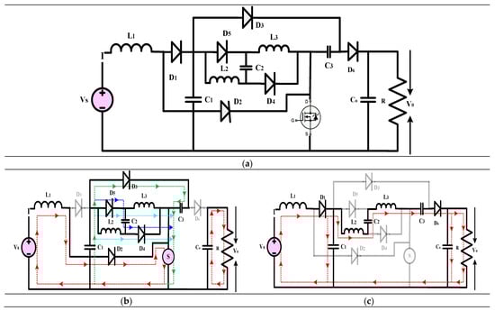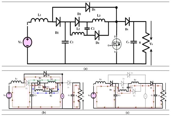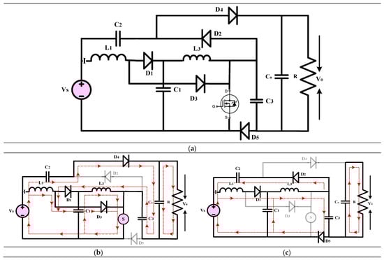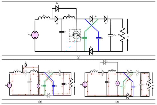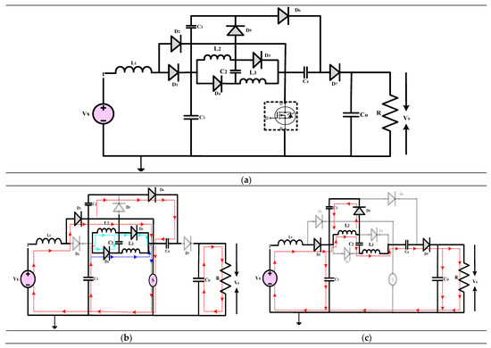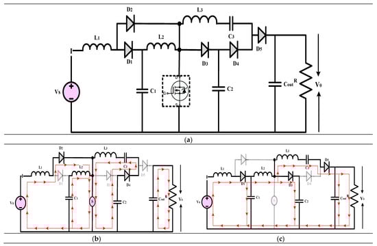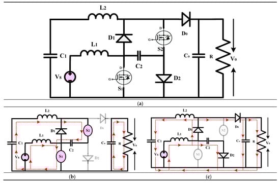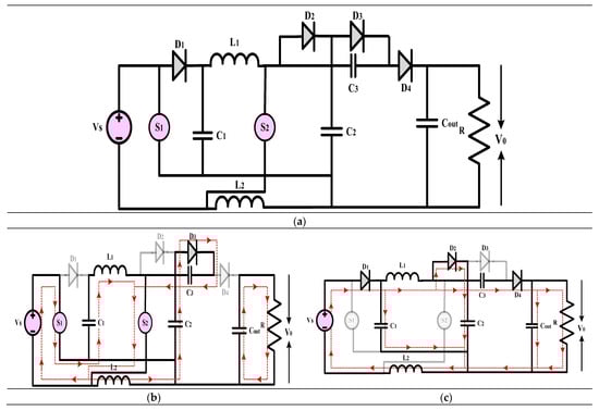 (a) Circuit diagram of QBC based high-gain converter (b) Mode-I Operation (c) Mode-II Operation.