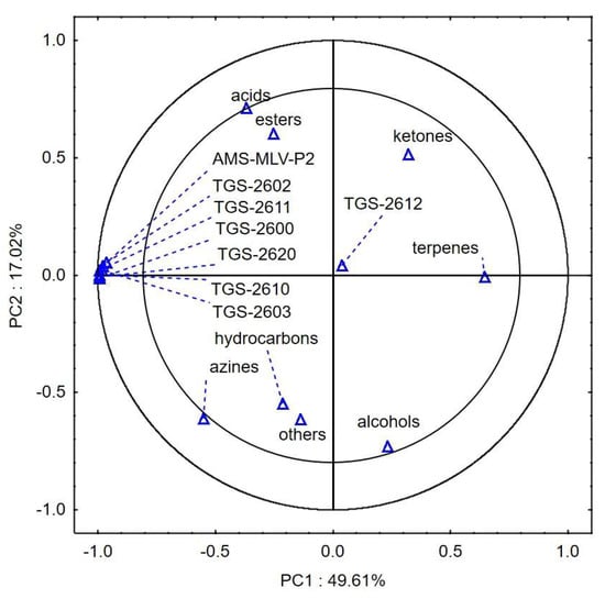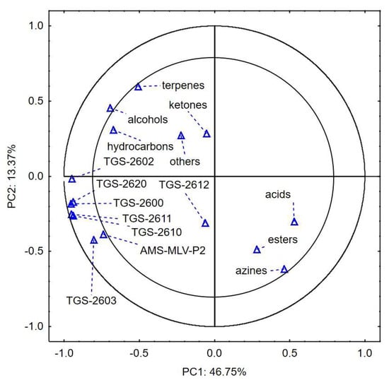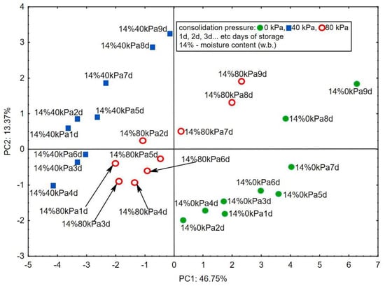 Figure 1 shows the projection of the variables for the 14% moisture content and 0, 40, and 80 kPa consolidation on the PC1 (46.75%) and PC2 (13.37%) planes. The first two principal components, PC1 and PC2, explain 60.12% of the variability of the system. A strong positive correlation was observed between the sensor responses related to the intensity of VOC emission and the changes in the content of alcohols, hydrocarbons, and terpenes. There was a negative correlation between the sensor responses and the content of acids, esters, and azines. The groups of ketones and “others” did not correlate with these variables; likewise, the responses of sensor TGS-2612 did not detect the changes occurring in the samples during storage. The values of the aforementioned variables are distributed in the closest vicinity of PC1 = 0 and PC2 = 0.