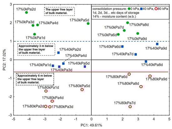 The changes in the quality degradation as a function of time are described above the blue dashed line for the upper layer—0 kPa; between the blue and solid red line for the middle layer—40 kPa; and below the red line for the closest layer to the silo bottom—80 kPa. Probably, the clear differentiation between the three layers of the corn groats bed by the electronic nose in relation to PC2 is the result of the enhancement of the quality degradation processes with the increasing corn groats moisture [20,33] relative to the moisture level recommended by storage standards (moisture content not more than 14% w.b.) [34] and the selective sensitivity of MOX sensors. This observation is consistent with the generally known trend that the safe moisture content for long-term storage of corn and its semi-finished products must be lower than 14%. When this value is exceeded, the factor resulting from the amount of vertical pressure determines the acceleration of the deterioration effect of bulk materials stored in silos. This relationship in the case of 17% humidity is described by the second main component, PC2.