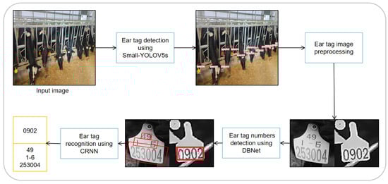 - The ear tag recognition method using DBNet [4] combined with CRNN [5] can quickly and accurately locate and recognize a multi-line regions of text on the same ear tag. Preprocessing operations such as character-level segmentation and image orientation correction are avoided, and images of handwritten and printed numbers on ear tags are mixed into the model during the model training stage so that it has a high recognition accuracy and generalization ability for numbering in the two types of fonts, as well as distortion, deformation, and other irregularities.